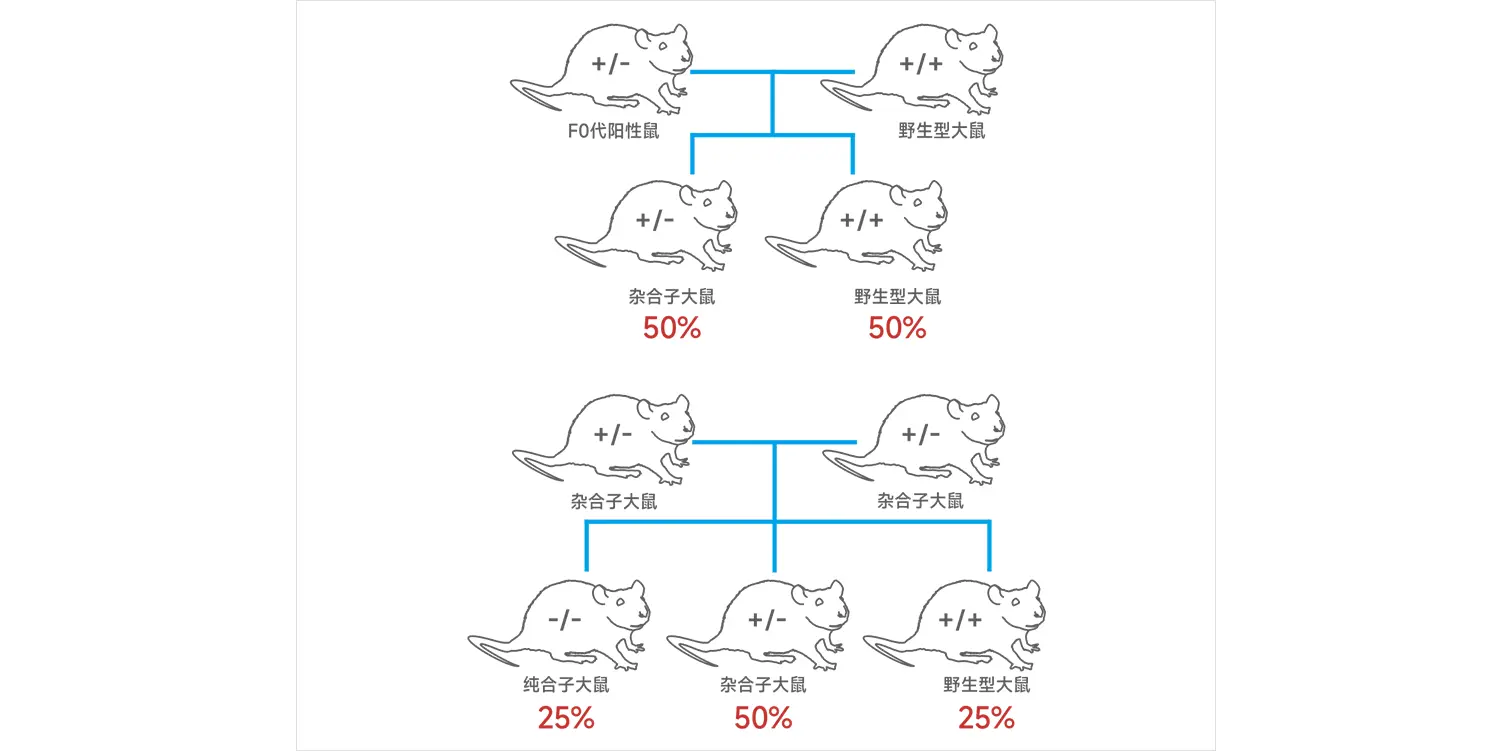 - 选择来自同一只F0代大鼠,基因型一致的F1代大鼠,达到性成熟后进行互配,可获得F2代大鼠。对获得的F2代大鼠进行PCR及测序鉴定,理论上,F2代大鼠中25%为纯合子,50%为杂合子,25%为野生大鼠。