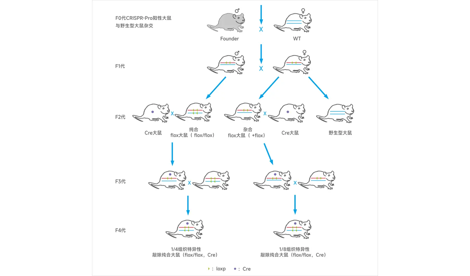 - 与野生型大鼠杂交:阳性CRISPR-Pro大鼠(+/flox)与野生型大鼠(+/+)杂交,获得F1代杂合子大鼠(+/flox)。