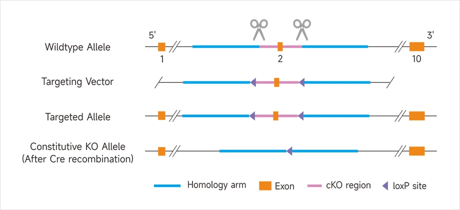 条件性基因敲除大鼠是通过把两个LoxP位点插入到目的基因的⼀个或几个重要外显子的两端以制备出flox大鼠,该flox大鼠在与表达Cre重组酶大鼠杂交之前,该基因表达正常;当flox大鼠与组织特异性表达Cre酶的大鼠进行杂交后,可实现在特定的组织或细胞中敲除该基因,⽽在其它组织或细胞中该基因表达正常。