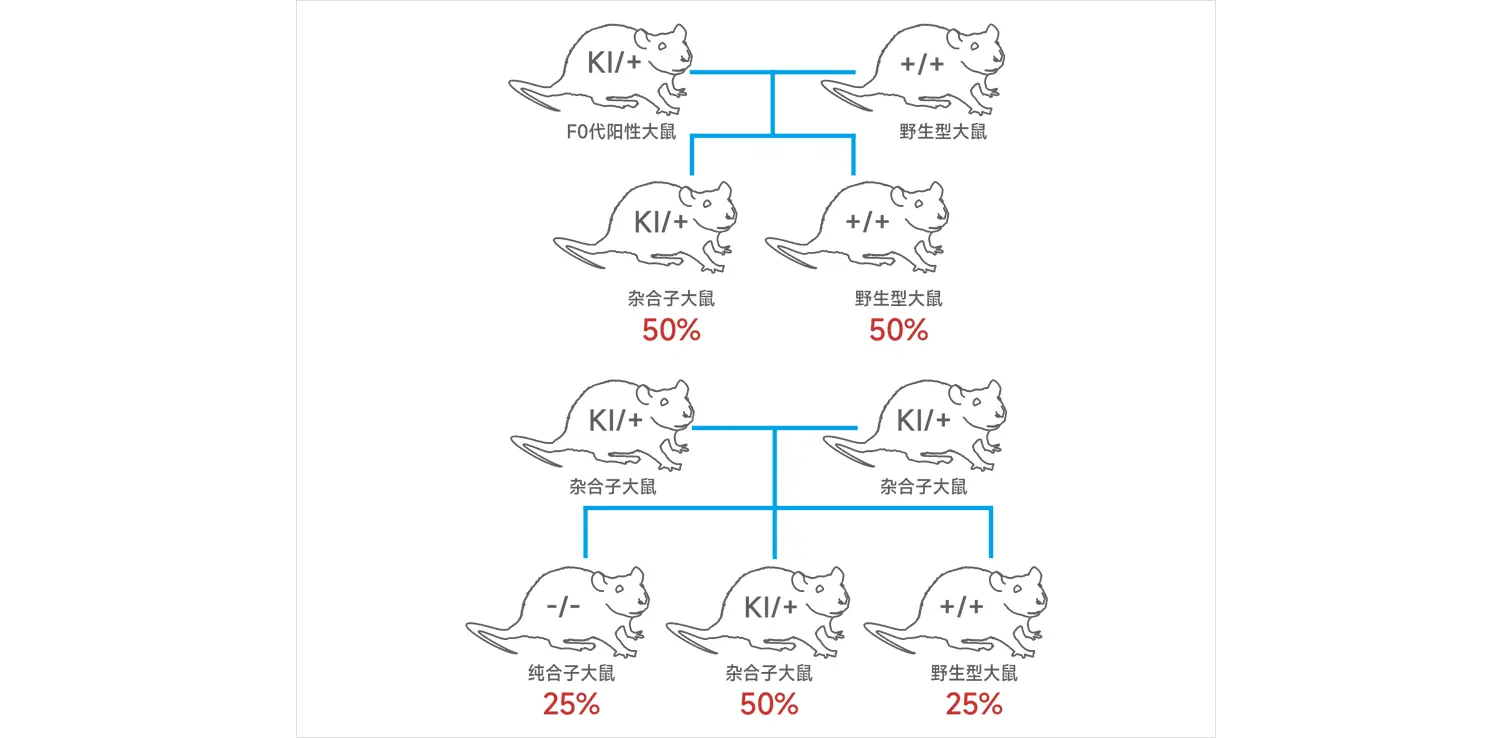 - 选择来自同一只F0代大鼠,基因型一致的F1代大鼠,达到性成熟后进行互配,可获得F2代大鼠。对获得的F2代大鼠进行PCR及测序鉴定,理论上,F2代大鼠中25%为纯合子,50%为杂合子,25%为野生大鼠。