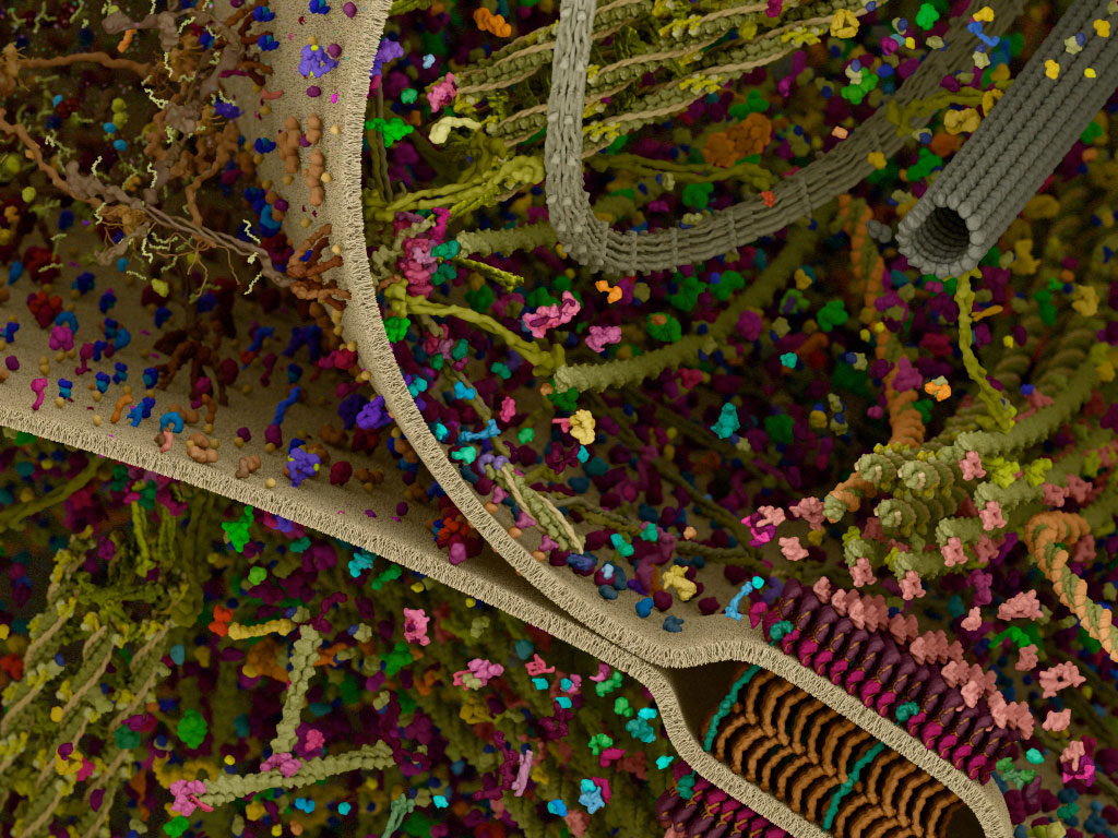涵盖细胞骨架结构以及与包括黏着连接的细胞黏附相关的蛋白质的交互式景观。结构数据来源于 PDB 和/或 EMDB,使用 Molecular Maya (mMaya) 建模。